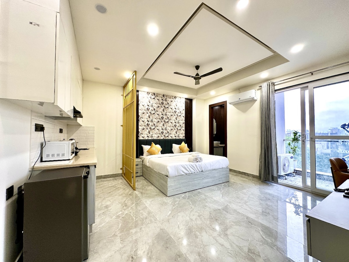 Մնացեք նորաոճ և լիովին կահավորված ստուդիական բնակարանում ՝ պատշգամբով, որը գտնվում է Սեկտոր 43 - ում, Գուրուգրամում ։ Կատարյալ է միայնակ ճանապարհորդությունների, զույգերի կամ կարճատև գործնական այցերի համար ։ Տարածքը ներառում է հարմարավետ մահճակալ, աշխատանքային տարածք, խոհանոց և առանձին լոգասենյակ ։ Վայելեք այնպիսի հարմարություններ, ինչպիսիք են Wi - Fi - ը, օդորակիչը, էլեկտրաէներգիայի պահուստավորումը և շուրջօրյա խնամողի աջակցությունը ։