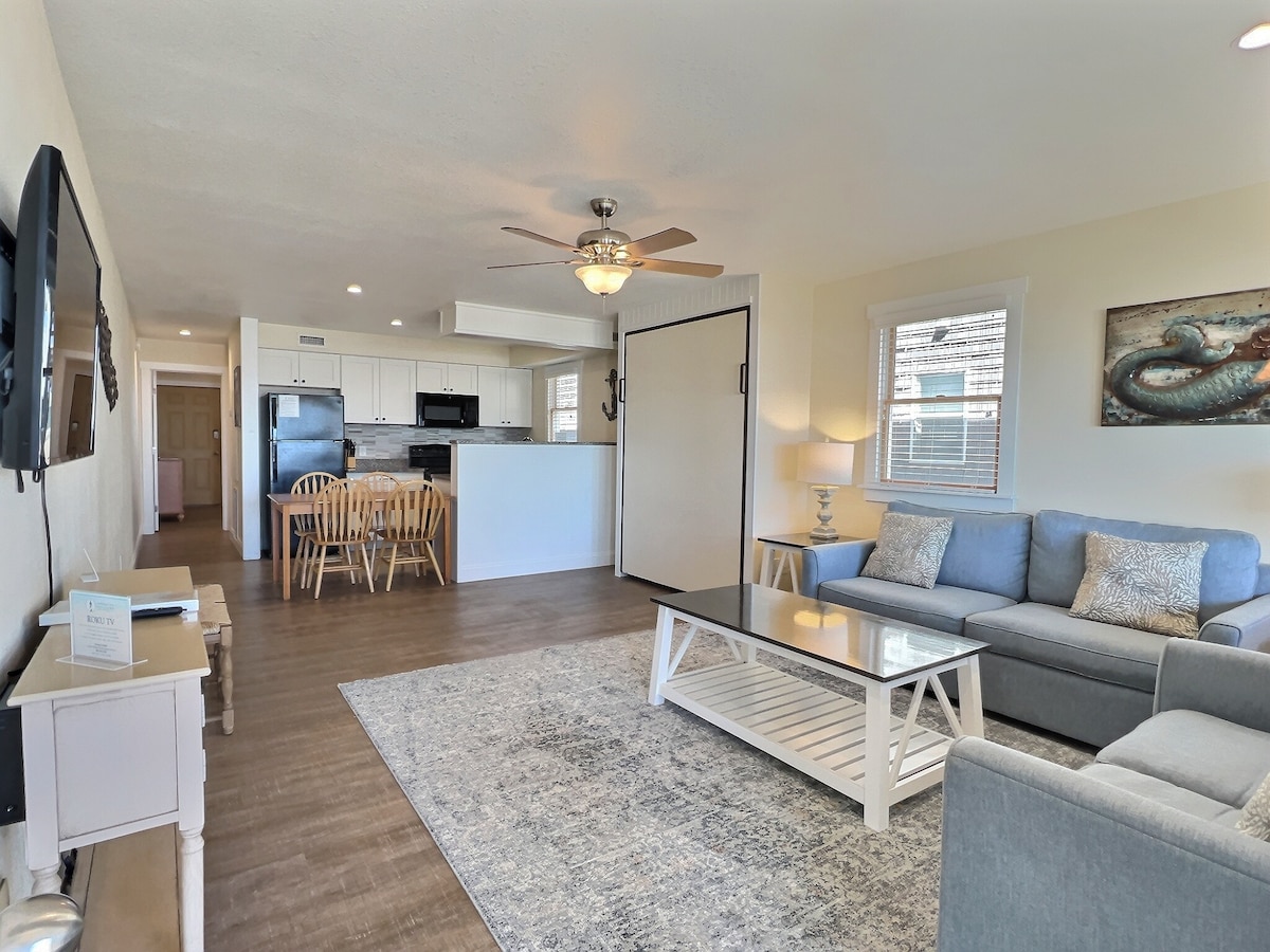 Cute առաջին հարկի կոնդոմինիում (առանց աստիճանների) Հատերաս գյուղի սրտում: Քայլելով հեռավորությունը դեպի լողափ, ձայնային, ռեստորաններ, գնումներ, ձկնորսական նավակներ եւ ուղեւորատար լաստանավի Ocracoke. Մեկ ննջասենյակով կոնդոմինիում ՝ համայնքի մեծ լողավազանով, գազօջախներով լողավազանի տախտակամածի վրա ։ Հյուրասենյակ ՝ ամբողջական բազմոցով և աթոռով: Խոհանոց ՝ 2 բարով, 2 այրիչով, ջեռոցով, միկրոալիքային վառարանով/ կոնվեկցիոն վառարանով, ամանալվաց մեքենայով, սառնարանով: Լրիվ լոգարան: Ննջասենյակ King bed - ով, հեռուստացույցով, մասնավոր պատիոով, որը տանում է դեպի լողափ տանող ճանապարհով: