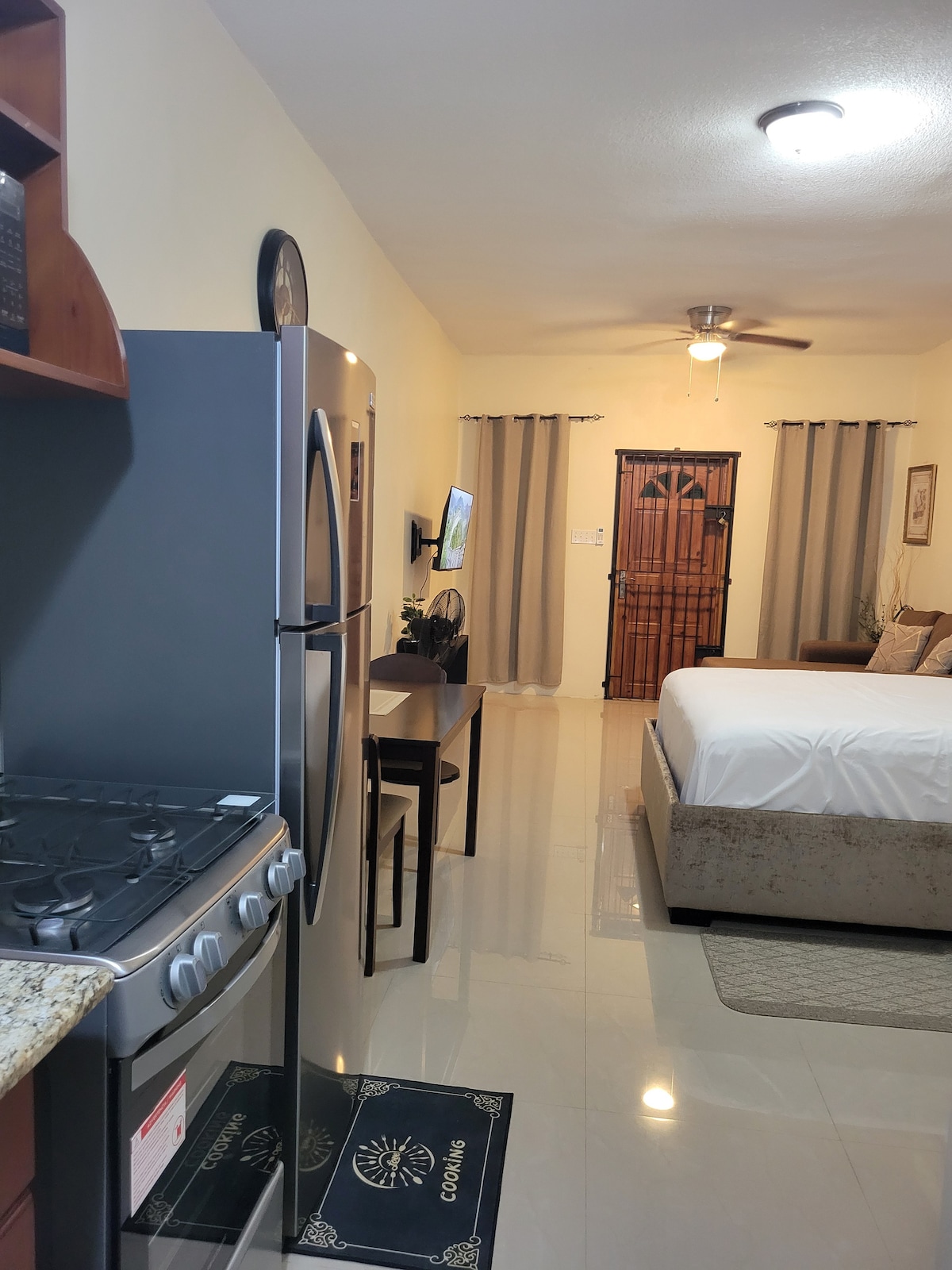 Այս բնակարանը գտնվում է դարպասային համայնքում, որը խնամքով նախագծված է և բացառիկ կերպով տեղադրված է Kingstons - ի լավագույն վայրերին մոտ, ինչպիսիք են Whitebones Seafood Restaurant - ը, Ribbis - ը, Acropolis Casino - ն, Market Place - ում, որտեղ գտնվում են UsainBolt - իTracks & records & Mall plaza - ն, պարզապես մի քանի անուն անվանելու համար: Դեկորն արվել է տարածքը հարմարավետ և ոճային դարձնելու համար ՝ խթանելով տնային միջավայրից հեռու ՝ առավելագույն հարմարավետության և փորձառության համար: