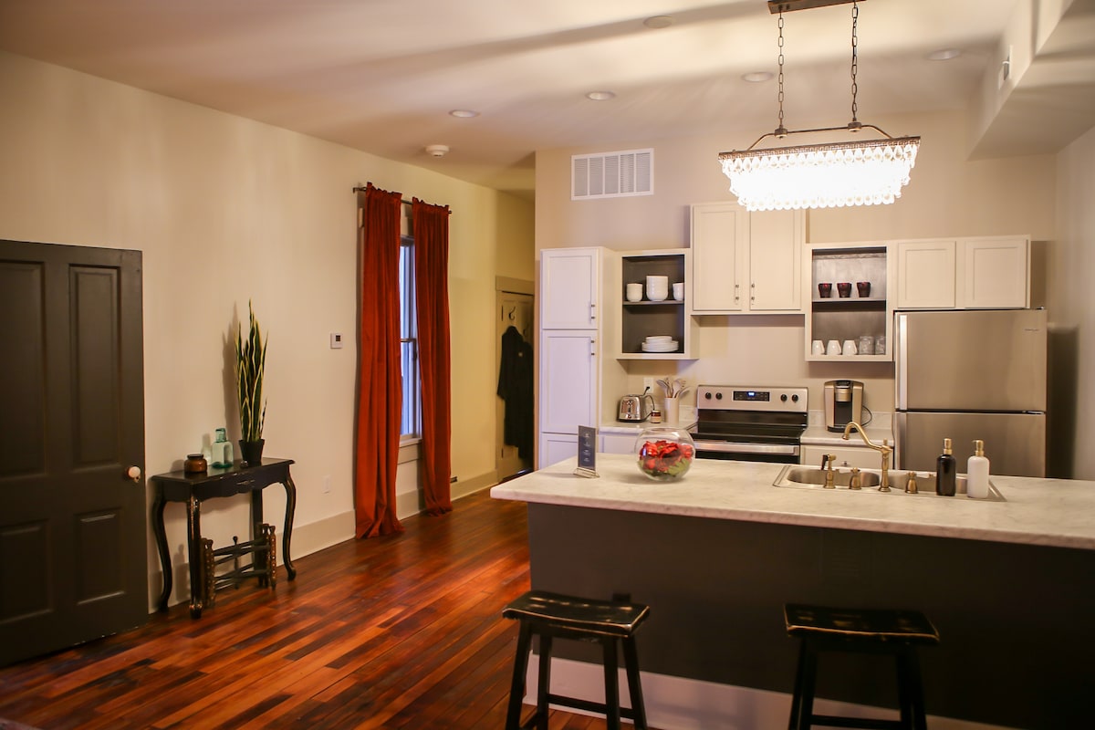 Built in 1863, this romantic second story 1 BR loft features the original hardwood floors and clawfoot tub with shower attachment. Enjoy a couples getaway within walking distance of downtown Council Grove, KS. After a day of exploring, return to grill your own Tiffany Cattle Company steaks on the outdoor terrace! Soak the everyday stress away before falling asleep in the queen-sized wrought iron bed. Enjoy free WiFi & modern-day amenities such as a Smart TV and stay as long as you like!