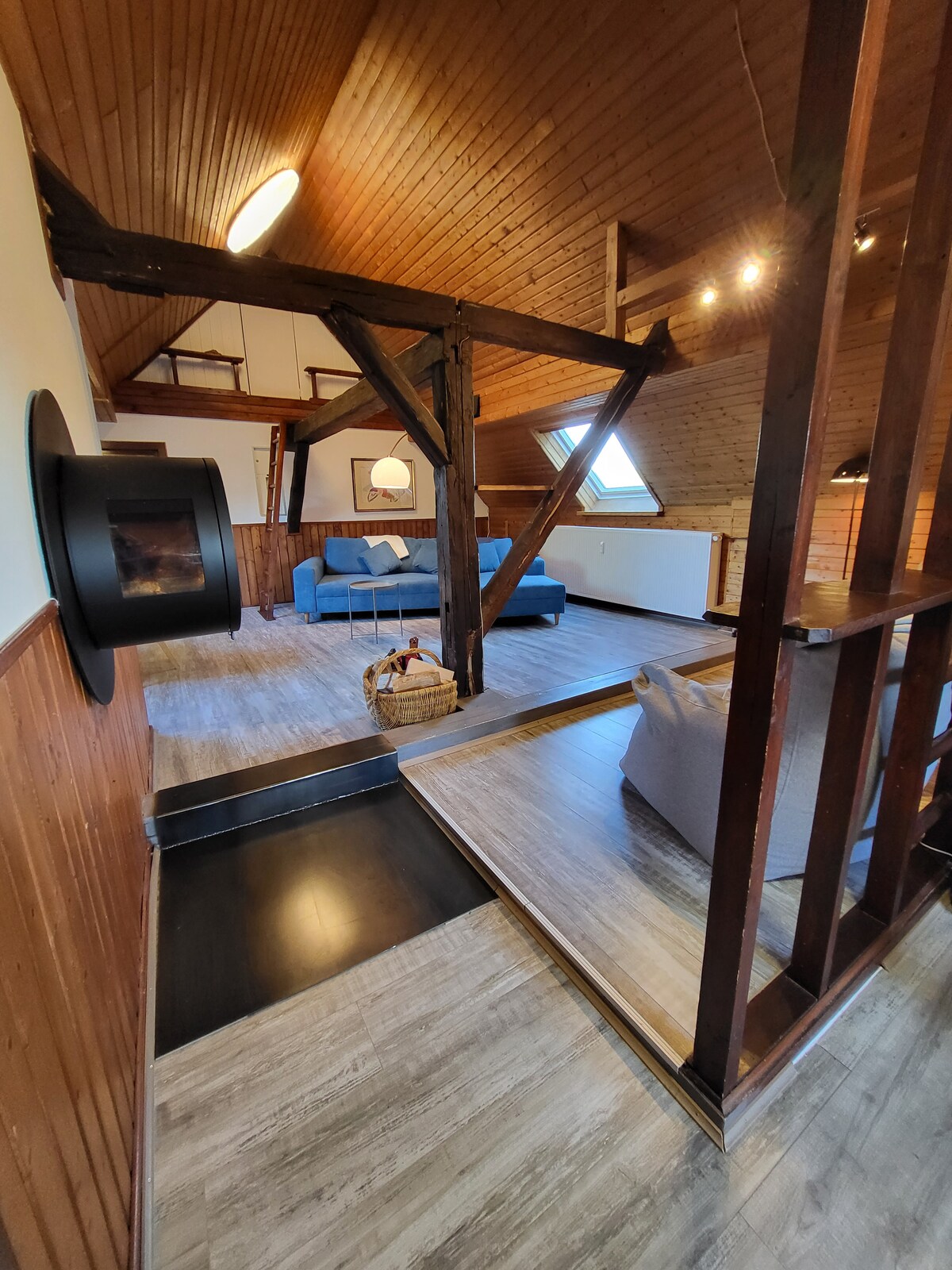 Last euch vom Vögelzwitschern wecken oder vom Kamin im Wohnzimmer wärmen ... Charmante Dachgeschosswohnung im Grünen mit 10 -12 Schlafplätzen. Ein Zimmer mit Doppelbett und einem Babybett. Ein Schlaf-/ Kinderzimmer mit einem Ausziehcouch und einer "Bettenlagerecke" mit einer Doppelbettmatraze und 2 Kindermatrazen, sowie einer Kinderspielecke. Zudem gibt es ein Kabuff mit Doppelbettmatraze (ist nur über eine steile Sprossenleiter zu erreichen) Im geräumigen Wohnzimmer gibt es eine Ausziehcouch.