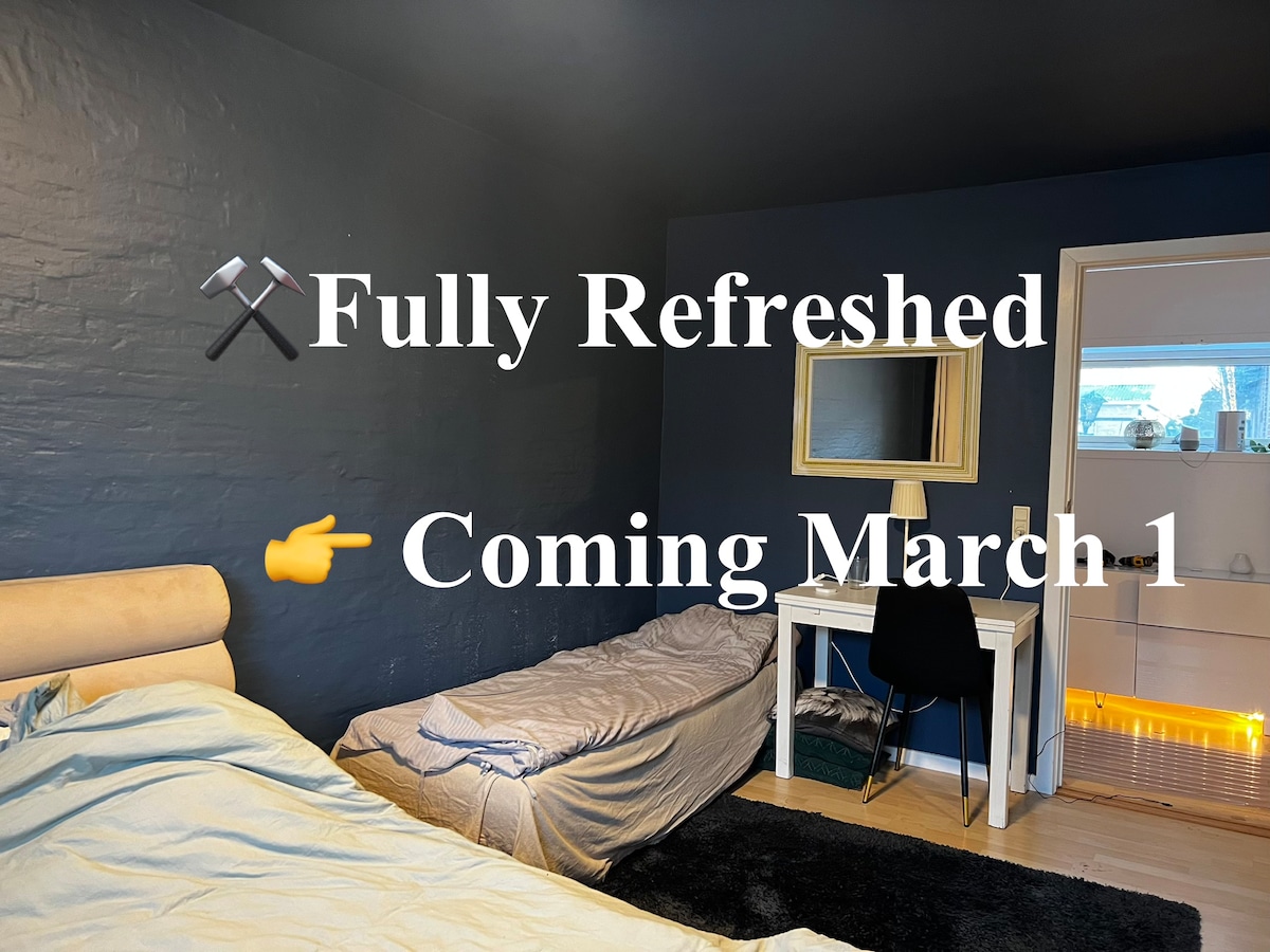 Hyggeligt Guesthouse · 24/7 Self Check-In 🤍 – du får din egen kode og kan komme, når det passer dig. Værelset har 2 gode senge, bord og stol, Smart TV og plads til dit tøj (ja, også overpakning 😉). Fælles køkken, bad og opholdsrum samt gratis parkering. Vi opgraderer løbende stedet, så der kan være små spor af forbedringer – men dit værelse er altid rent og klar.