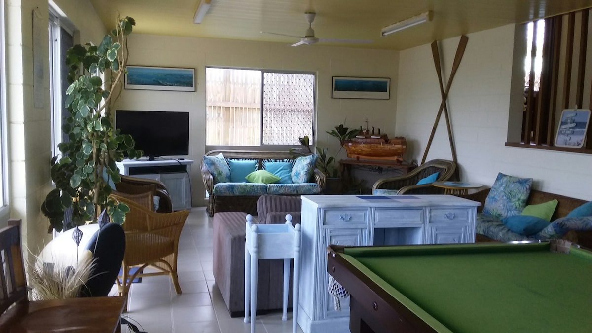 The house is situated close to the CBD of Ingham and Railway station. The Herbert River district is sugar cane growing district, so therefore sugar trains run 24/7 from mid June to end November so could be a little nosy. The house has two bedrooms, each with air-conditioning. Main bedroom has a queen bed, 2nd room has 2 king single beds. Kitchen and lounge is open set, with a double fold out lounge. Laundry is down stairs, yard is fully fenced. We are pet friendly.