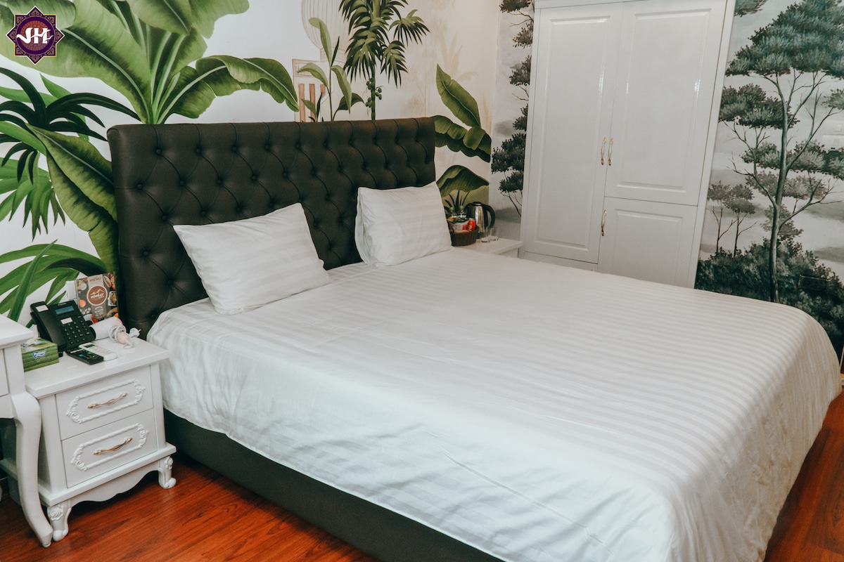 Այս սենյակում կա ժամանակակից հարմարավետ կահույք ՝ • երկտեղանի մահճակալ և փոքր երկտեղանի մահճակալ • օդորակիչ (զով և տաք) • 32դյույմանոց արբանյակային LCD հեռուստացույց ՝ միջազգային ալիքներով • Սառնարան • հագնվելու սեղան • Լուսավոր պատուհանից երևում են Հանոյ Օլդ Սթրիթ թաղամասի փողոցն ու տանիքները • առանձին լոգասենյակ ՝ տաք ջրով • WI - FI ինտերնետը սենյակում Այս սենյակը գտնվում է բարձր հարկում, որտեղից բացվում է գեղեցիկ տեսարան դեպի Հանոյ Հին փողոցի թաղամաս ։