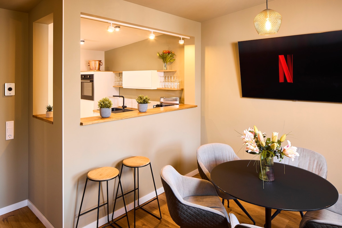 Այս նորաոճ և հարմարավետ բնակարանը գտնվում է քաղաքի կենտրոնում ։ Կանգառը դռնից անմիջապես այն կողմ է, հիմնական երկաթուղային կայարանը գտնվում է ընդամենը երկու կանգառ հեռավորության վրա ։ Մոտակայքում կգտնեք բազմաթիվ սրճարաններ, ռեստորաններ և գնումներ կատարելու հնարավորություններ: Թոմասկիրշեն և ոտաբոբիկ ծառուղին արագ հասանելի են ։ Ավտոկայանատեղին ապահովում է լրացուցիչ հարմարավետություն և իդեալական է կյանքի բարձր որակով քաղաքային կյանքի համար ։