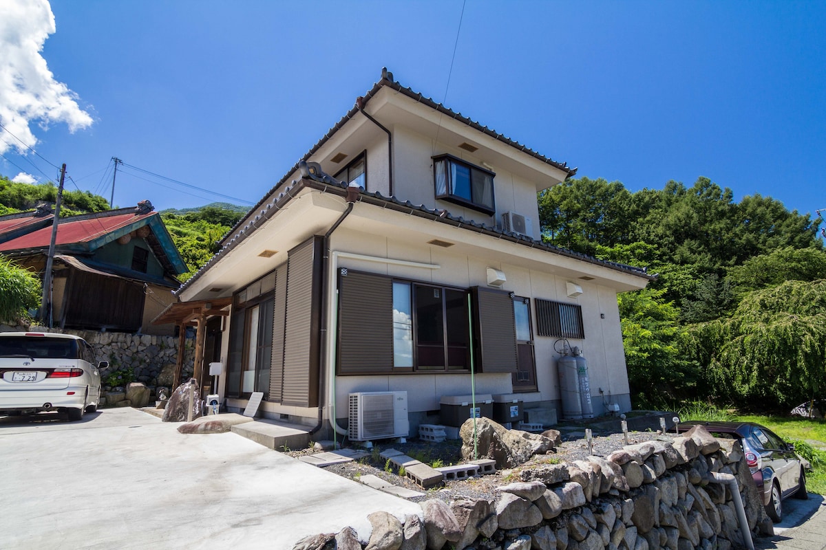 Experience a traditional Japanese farmhouse with stunning views of the Chuo Alps. The private guest area includes a living room, kitchen, bathroom, and bedroom, with a cozy, authentic interior featuring traditional beams and natural materials. Enjoy the hilltop with a spacious garden and forest. Relax with a campfire, BBQ, or stargazing under a clear sky. In winter, warm up by the wood stove or enjoy a wood-fired bath in the traditional bathhouse, surrounded by nature and tranquility.