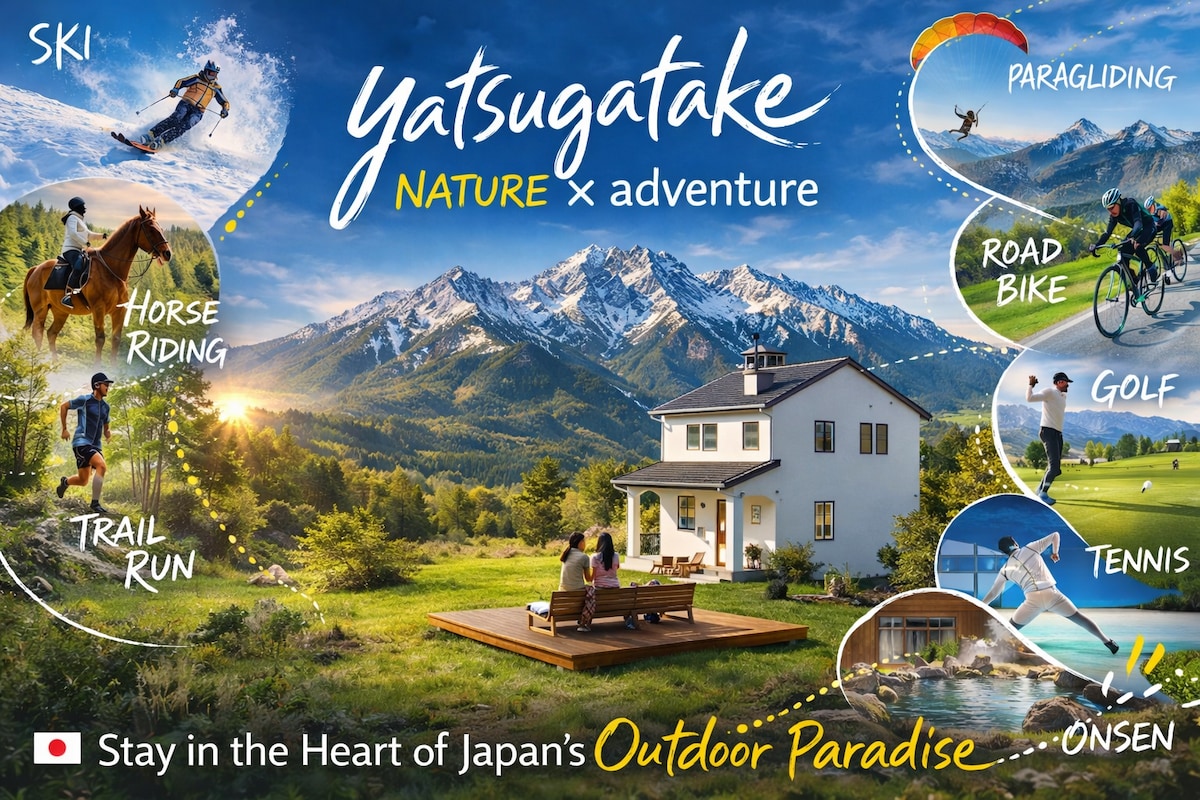 【Main House】 All 3 rooms have a view of Mt. Art house for rent for up to 8 people, 6 people recommended Fully equipped for work stay. 【Irori & spa】 A half-open-air bath with a view of the garden that can accommodate 4 to 5 people at the same time. →Bath using high quality well water from the Yatsugatake Mountains. 【Sauna area】 Russian tent sauna [MORZH MAX] that can accommodate about 8 people. 【BBQ area】 A covered area with plenty of room for about 10 people to BBQ.