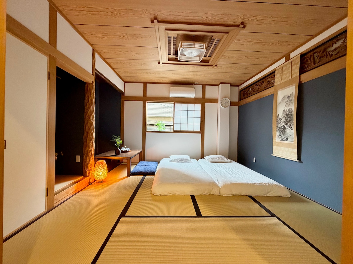 【Japan 8】2楼2号房 【和风物语 · 蓝调静谧】 🏠 空间布局 (The Space) 60平米,2居室,最多容纳4人。 这间位于二层的公寓,为您提供了一个既能深度体验日式传统、又充满现代居家便利的私人空间。 - 独立二层空间:您将独享整个二层,拥有完全的隐私。 - 卧室 A(传统和室):配备双人榻榻米。深蓝色的质感墙面配以精美的传统木雕横梁。在暖色落地灯的映衬下,榻榻米空间显得格外温馨深邃,是深度睡眠的绝佳选择。 - 卧室 B(现代居室):配备 1 张舒适双人床。此房间与厨房区域相连,中间以精致门帘作为灵动隔断,消除了视觉上的压抑感,让空气与光线在空间内自由流动。 - 餐厨一体区:设备齐全的现代厨房(微波炉、烤箱、厨具等)与温馨的实木餐桌,非常适合全家人一起享受地道的大阪食材料理。