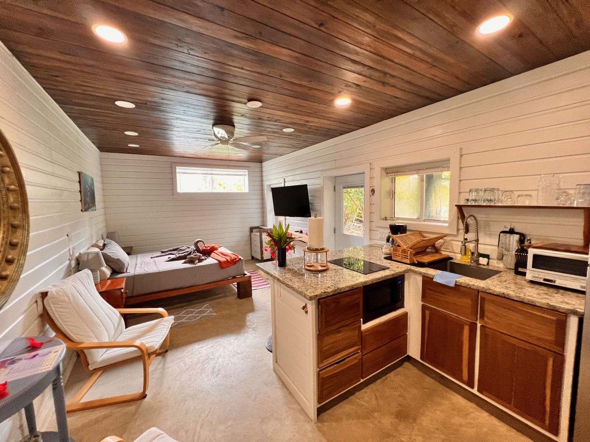 A piece of paradise at your doorstep. Wake up to the sunrise over the ocean with birds singing all around, fall asleep the the oceans waves. What more could one want… peace, serenity and beauty. One bedroom with queen bed newly renovated. Enjoy the private beach on a home compound with hammocks, loungers and yes, bbq those marshmallows in the fire pit on the beach. Located approximately 20 minutes to Placencia and 30 min to Hopkins village. Excursions within 15-30 minutes away.