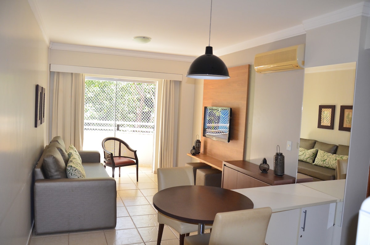 Գեղեցիկ բնակարան լողավազաններ Veredas Flat հյուրանոցում: Նոր և կահավորված բնակարան ՝ ձեր հանգստի և հանգստի օրերին հիանալի հանգիստ վայելելու համար ։ Համատիրություն ՝ լիարժեք ժամանցով, մեկ ավտոկայանատեղի և ննջասենյակում և հյուրասենյակում օդորակիչով կահավորված բնակարան, WI - FI, խոհանոցի հավաքածու, գազօջախ և այլն: Ննջասենյակ ՝ երկտեղանի մահճակալով և մեկ մահճակալով, և հյուրասենյակ ՝ երկտեղանի թախտով ։ Նշում. Տաք ջրի գետի մուտքը վերադարձել է!!!