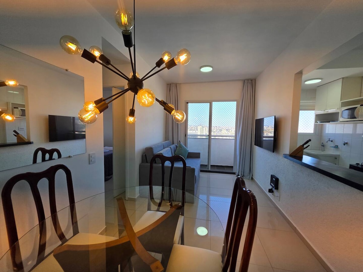 @35skyblue - ում դուք կզարմանաք մուտքից ՝ յուրահատուկ փորձառությամբ ։ Անհանգաբաու հովտի և Սան Պաուլոյի կենտրոնի եզակի տեսարան ։ Aconchegante և ժամանակակից տարածքում հարմարավետորեն տեղավորվում է մինչև 4 հոգի ։ Ներառված է ՝ ինքնուրույն ժամանում, կենցաղային տեխնիկա, խոհանոցային պարագաներ, Wi - Fi, սմարթ հեռուստացույց Netflix - ով, A/C, երկտեղանի մահճակալ և թախտ, զուգարան, հարմարություններ ։ Շենքն ունի լվացքատուն, ռեստորաններ, սրճարաններ և տեսարժան վայրեր, օրինակ ՝ Սամպա Սքայ ։ Երբ մնաք @ 35skyblueպիտակով լուսանկարներում: