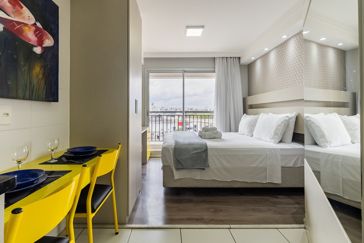 Contamos com a maior TV que você verá em um Studio em São Paulo :) para super experiência 4K com Netflix e Globoplay inclusos :) PISCINA E AR CONDICIONADO PARA O SEU VERÃO ! Fácil acesso ao Allianz Parque. Venha ver o mirante mais belo da capital, internet 500 Megas, fogão, microondas, cama de casal , academia, piscina, sauna, um terraço com visão panorâmica do centro, além da visão do horizonte e da imaginação. Mercados próximos, tudo por uma incrível experiência na capital de São Paulo.
