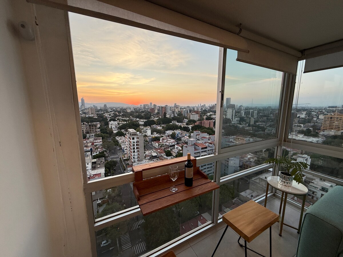Վայելեք Գվադալախարայի գեղեցիկ մայրամուտները քաղաքի ամենաանվտանգ, լավագույն կապակցված և գաստրոնոմիական թաղամասերից մեկում: Տնային կենդանիների համար հարմար այս ժամանակակից ստուդիան նախատեսված է կարճաժամկետ կամ երկարաժամկետ այցերի համար ։ Այն ունի արտասովոր տեռաս ՝ ձեր այցելությունները ողջունելու համար: Այն մի ամբողջ բնակարան է ՝ երկտեղանի մահճակալով, ճաշասենյակով, ամբողջական խոհանոցով, առանձին տեռասով, լվացքի մեքենայով, արդուկով, հեռուստացույցով, ինտերնետով (100 Մբ) և անվտանգ ։ Այն գտնվում է երրորդ հարկում, վերելակ չկա: