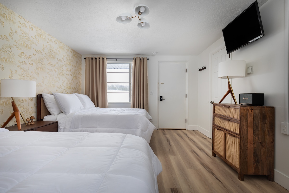 Relax in a comfortable, recently updated room with two queen beds, ideal for families or small groups. The room includes free Wi-Fi, TV, mini-refrigerator, microwave, and a one-cup coffee maker. We offer contactless self-check-in and do not have a traditional front desk; all reservations are handled online or by phone, with support available by call or text. Clean, simple, and convenient for a comfortable stay near the lake.