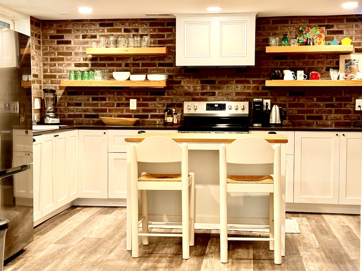 Ընդարձակ մեկ սենյականոց նկուղային բնակարան: Առանձին մուտք, զուգարանով լոգասենյակ և խոհանոցիկ ՝ բոլորը նոր են արված ։ Թարմ լանդշաֆտային սալաթե պատիո ՝ պարտեզով և լճակով ։ Հոսող ջրի ձայնն ապահովում է հանգստացնող միջավայր: Հետևի բակը դեպի գեղեցիկ անտառներ է: 5 րոպե հեռավորության վրա հեծանվային արահետներով: Մեծ, բաց բնակելի տարածք ՝ սեկցիոն բազմոցով և կից ուտելու տարածքով, որտեղ կա սեղան, որը կարող է կրկնապատկել որպես աշխատանքային կայան ։ Կենտրոնում գտնվում է Montgomery County - Approx 40 րոպե DC/Baltimore/Frederick.