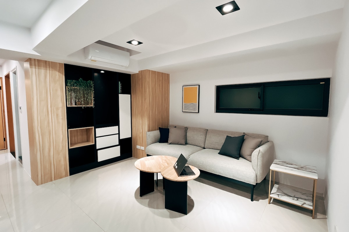 室內的灰白主色,配搭北美木紋銅色傢俱及家飾, 用心為您的居住空間提供沈靜優雅的感覺。日韓系電器的選用,不論是無線充電藍牙喇叭 ,大螢幕伸縮高清電視 ,都能滿足您對影音效果的要求。房源位於高樓內縮樓層,阻絕不必要的噪音並滿足您對景觀 ,安靜及隱私的要求。大樓並配有全天候警衛,住戶專屬電梯 ,公用大露台 ,以及地下收費停車場, 位處西門町核心路段,無論搭乘捷運或自駕都非常方便。Earth tone - ի վրա հիմնված ինտերիերի դիզայնն առաջարկում է տաքացում, հանգիստ, բուժիչ և ուրախ մթնոլորտ: Սենյակի հարմարություններ, այդ թվում ՝ երկտեղանի մահճակալ, լոգասենյակ ՝ ցնցուղի պարիսպով, օդորակիչ, սմարթ 4K հեռուստացույց ՝ ֆիլմերով/Netflix, WI - FI ինտերնետ, խորանի լուսավորություն և երաժշտական նվագարկիչ ՝ անլար կապով և USB լիցքավորիչի պորտերով ։