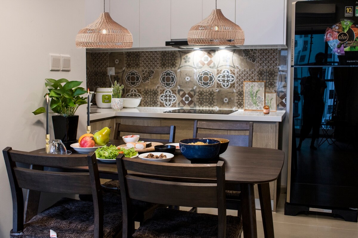Scandinavian là phong cách thiết kế và trang trí nội thất theo kiểu “Hygge”. Ở đây Hygge tạm hiểu là phong cách sống ấm cúng và thoải mái đến từ đất nước được mệnh danh là nơi hạnh phúc nhất thế giới – Đan Mạch. Không gian phòng ăn tại đây là 1 thiết kế điển hình của Scandinavian. Sàn gỗ tự nhiên cùng chất liệu với chân ghế, bàn ăn và cây cảnh mang lại cảm giác của như đang ở ngoài trời. Các bức tường sơn trắng giúp tối đa hóa ánh sáng. Những chiếc ghế ăn và đèn thả phong cách Bắc Âu hiện đại.