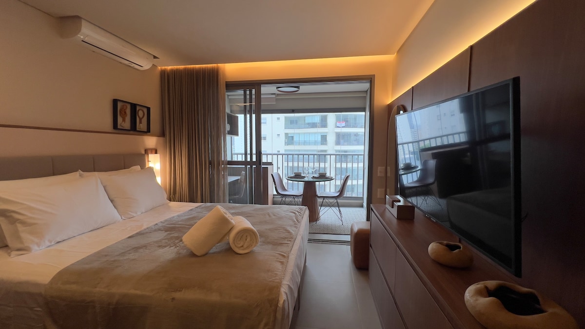 Սոֆիստիկադո ստուդիա բարձր հարկում ՝ պատշգամբից բացվող շքեղ տեսարանով ։ Այն գտնվում է Eucaliptos մետրոյից և Իբիրապուերա առևտրի կենտրոնից ընդամենը մի քանի քայլ հեռավորության վրա ։ Ստոնանտե հանգիստ տանիքում ՝ օդորակիչով լողավազանով, սաունայով և մարզասրահով ։ Բարձրակարգ կահույք և սպասք: Կորտինան սևանում է 100%- ով, աղմուկով պատուհանը, բամբակյա անկողնային պարագաները ՝ 200 մանվածք և օրթոբոնային ներքնակ, ապահովում են որակյալ քուն ։ Գերարագ ինտերնետ ՝ լարային տարբերակով և էրգոնոմիկ աթոռով ՝ ձեր հարմարավետության համար, եթե անհրաժեշտ է աշխատել ։