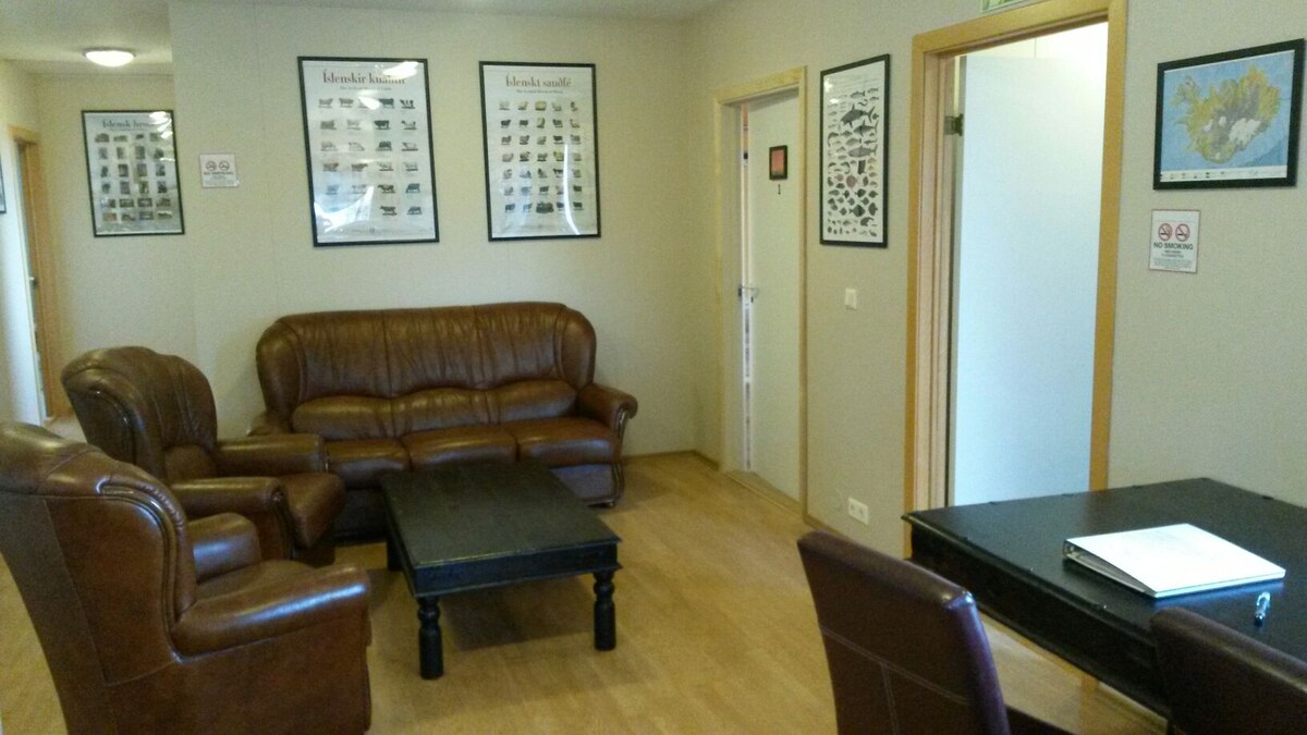 We are in the heart of Skagafjörður, and Sauðárkrókur is just ten or twelve minutes away by car. All year round, lodging is accepted. The five rooms in the main house "Gulluhús" share a bathroom. Four of the rooms are on the upper floor, one on the ground floor, and the restrooms are located on the ground floor. The old farmhouse has been converted into five spacious bedrooms, each with its bathroom.