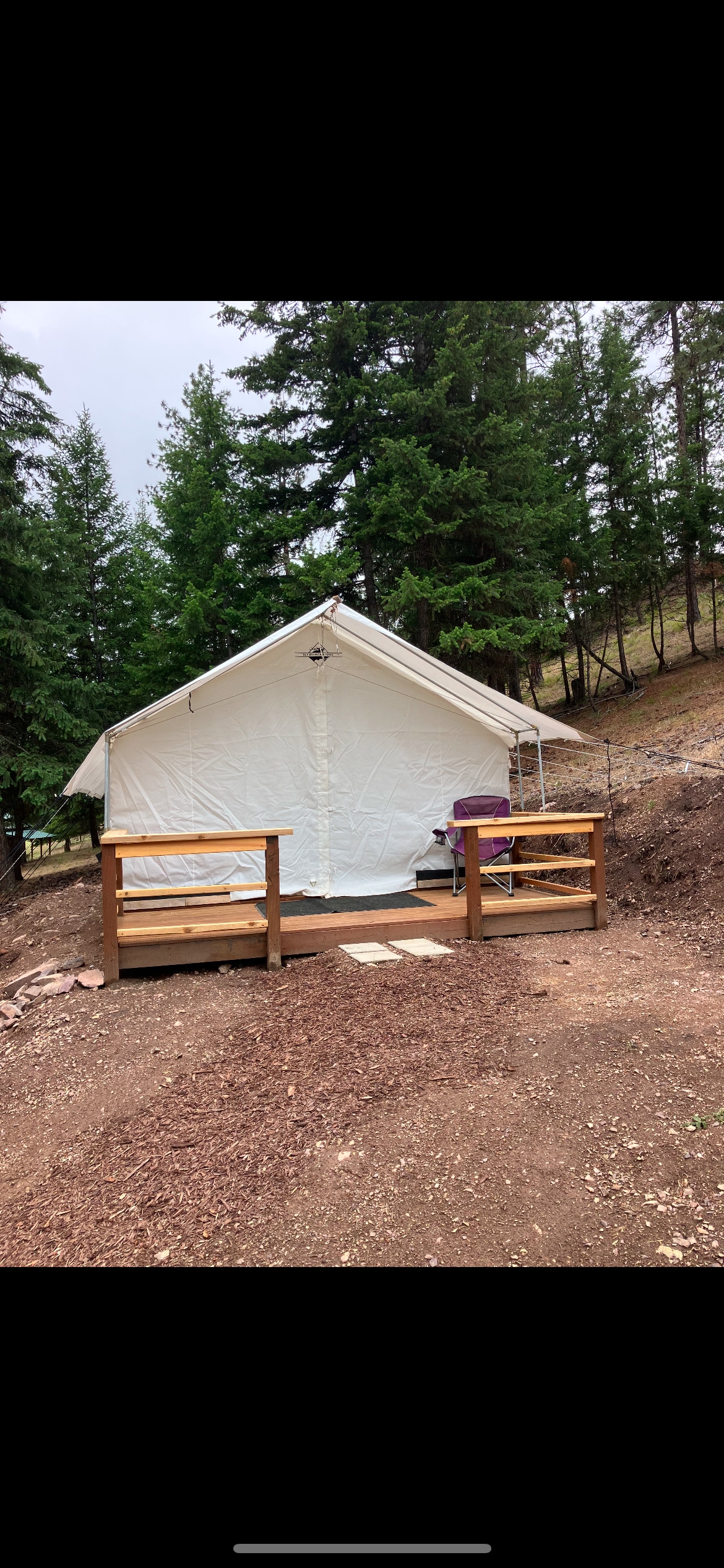 With a perfect view of Sula Peak, Tent #1 is a 12x14 canvas tent featuring a comfortable king bed complete with linen and an electric blanket covered by sherpa bedding. A cozy woodstove and free firewood provides warmth, allowing the tents to be bookable year-round. Wi-fi is free, and each tent has one power strip for electronics. Patio chairs, propane barbecue, and a communal picnic table are at the campsite for your enjoyment. Come enjoy the beautiful Bitterroot Forest in all its splendor!