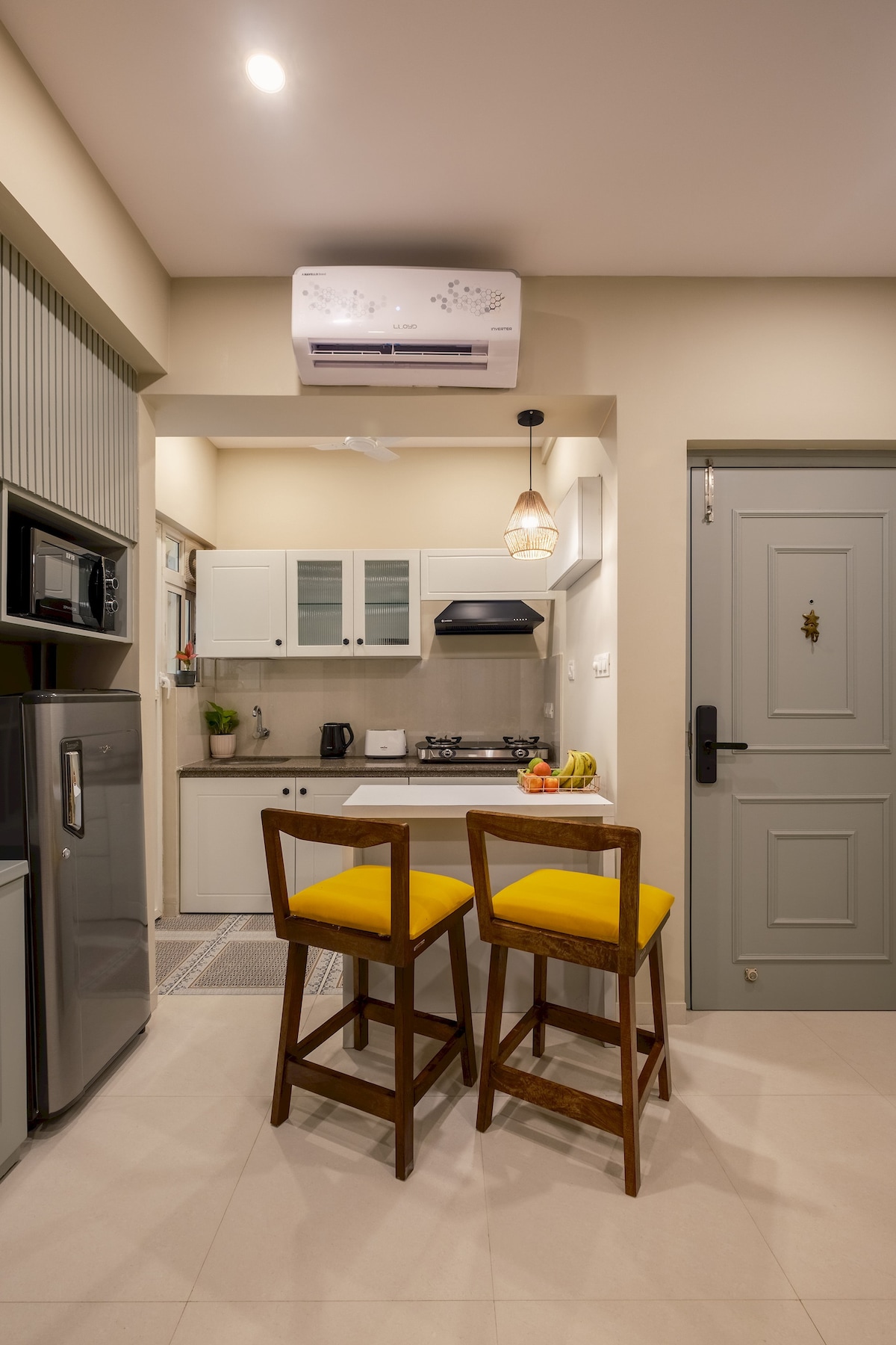 Մաքուր և հարմարավետ 1BHK բնակարան Ադորա դե Գոայում՝ օդանավակայանին մոտ գտնվող փակ համայնքում։ Տունը հարմար է հանգիստ հանգստի համար՝ հարմարավետ հյուրասենյակով, հարմարավետ ննջասենյակով, օդորակիչով, արագ Wi-Fi-ով, սմարթ հեռուստացույցով և խոհանոցով՝ թեթև ուտեստներ պատրաստելու համար։ Այն խաղաղ և լավ լուսավորված է, իդեալական է կարճաժամկետ այցերի, տարանցիկ հյուրերի, զույգերի և գործնական ուղևորությունների համար։ Հյուրերը կարող են օգտվել ընդհանուր հարմարություններից, ինչպիսիք են լողավազանը, մարզասրահը և բացօթյա տարածքները՝ ըստ համայնքի կանոնների։