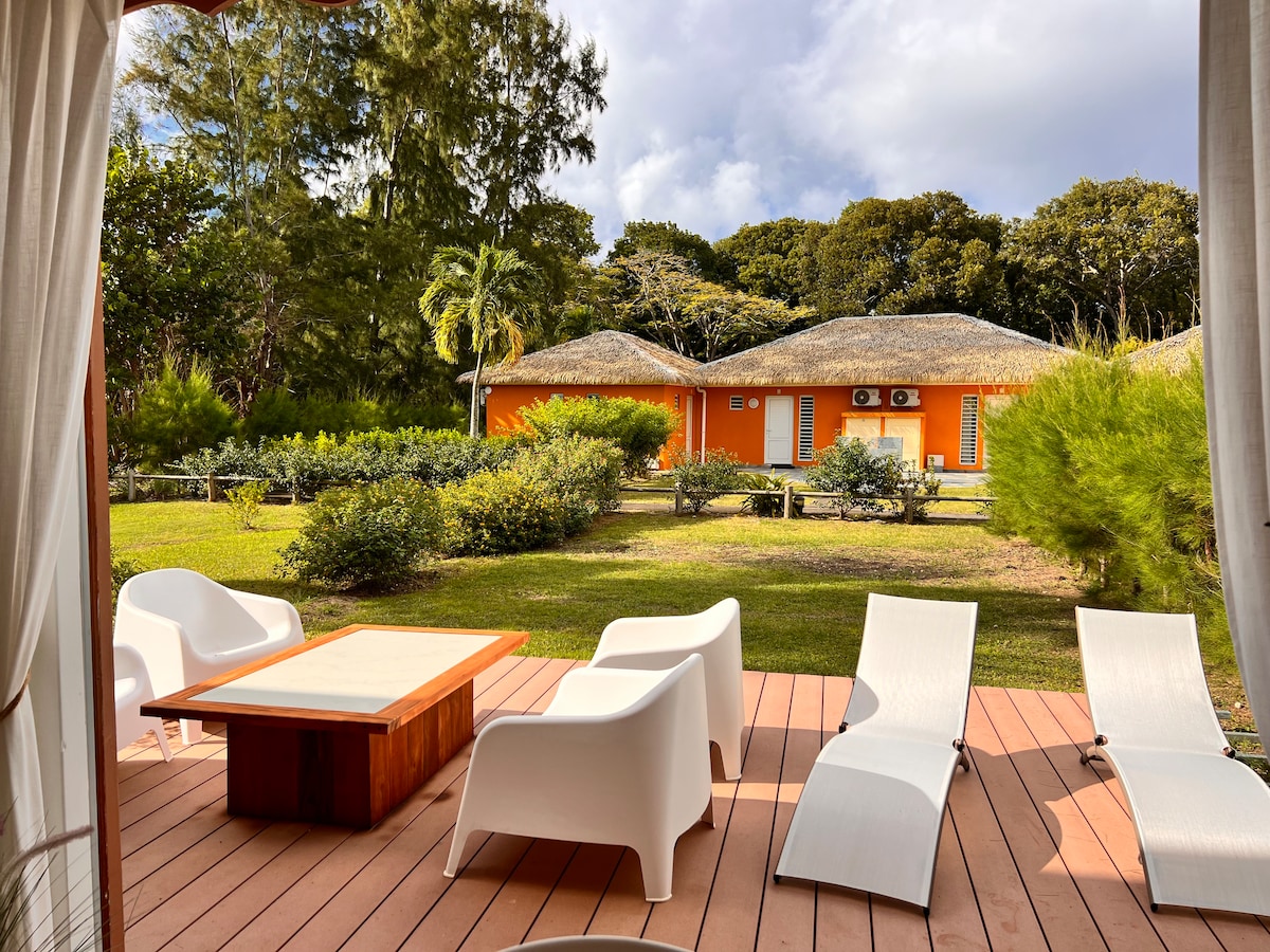 Եկեք և հանգստացեք բուգենվիլեաների, հիբիսկուսների, իլանգ-իլանգների միջև՝ փոքրիկ էկոլոջում, լիակատար ինքնավարության մեջ, փոքրիկ կախովի պատշգամբով, առանց որևէ տեսարանների։ Կարող եք ճոճվել ճոճանակով, ցանցաճոճով կամ կախովի նստատեղով (կախված քոթեջից) թարմ քամու տակ, որը փայլեցնում է ձանձրույթը։ Երեք կղզիների լողափը 5 րոպե հեռավորության վրա է, որտեղ կարող եք լողալ արևամուտին։