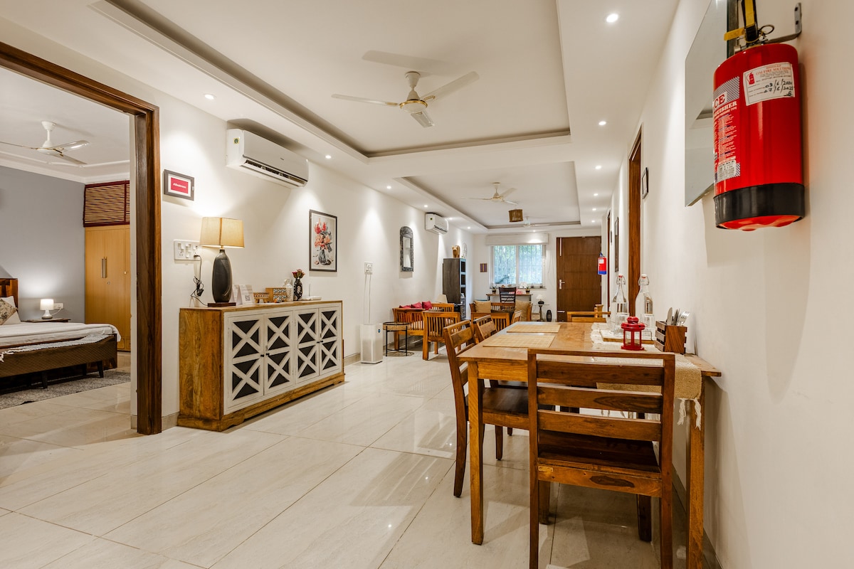 Bring your family or group of friends to this beautifully designed space that blends comfort, style, and a prime location in the heart of Gurgaon. Whether you're in town for work or a weekend getaway, this cozy home offers everything you need - spacious bedrooms with plush beds, built-in wardrobes, and clean, private bathrooms for a relaxing stay. The open-concept entryway creates the perfect setting to enjoy quality time, play games, share meals, or simply unwind together — just like home.