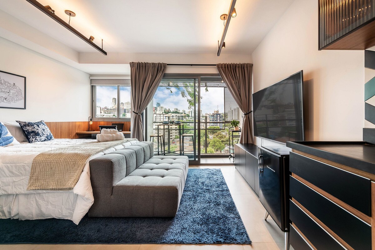 Sophisticated and well-equipped studio between Pinheiros and Vila Madalena. It features a double bed, private balcony, workspace, full kitchen, Smart TV, fast Wi-Fi, and air conditioning. The building offers a gym, coworking space, and 24/7 security. The building blends modern architecture with urban art. Ideally located near Fradique Coutinho metro station, top bars, and renowned restaurants. Perfect for short and long stays.