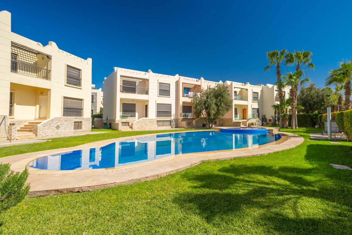 Appartement standing à Marina Agadir meublé avec goût, entièrement équipé. -1 CHAMBRE PARENTS+ DRESSING + SALLE de BAIN (baignoire) +loggia. - 1 CHAMBRE d’AMIS +Salle de Bain (douche) - 1 SALON 2 CANAPÉS + TV +wifi gratuit+ balcon - 1 SALLE à MANGER, 6 chaises (idéale pour télétravail) - 1 CUISINE ÉQUIPÉE La Résidence est située en front de mer, entourée de jardins luxuriants; de magnifiques piscines; à proximité de la plage; corniche; port de loisirs; boutiques...etc
