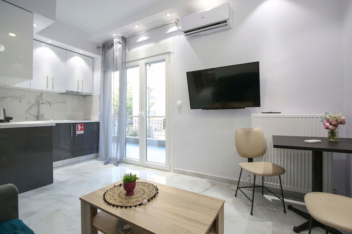 Unique 1 Bedroom fully equipped apartment on the seventh floor of a 2020 renovated building with a breathtaking terrace balcony. High speed internet, premium amenities, a luxurious queen size bed, and your very own Netflix account are but a few things we offer you. Luminous, spacious, with everything you might require to enjoy your stay in the heart of Thessaloniki's social life, only 5 minutes away from Aristotelous square and 2 minutes from the seafront. Welcome and enjoy your stay!