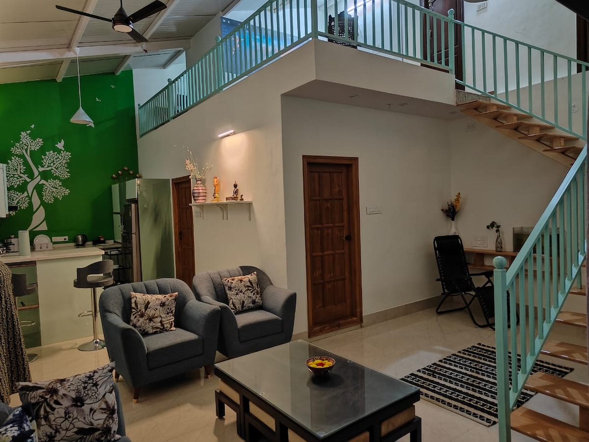 This is a luxurious & spacious penthouse situated in the center of Bangalore and it has 3 levels with plenty of private outdoor space. The greenery and the natural light coming from the skylight and huge glass windows are the highlights. The house is fully loaded with all the modern amenities required for a great stay. Daily housekeeping, 24/7 power, lift, car parking, modern kitchen, bar,desk space for work, high-speed internet, 65 inch TVs, JBL 5.1 soundbar are some of the standard amenities.