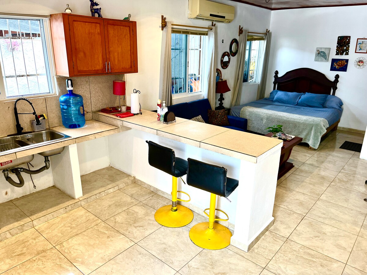 A Perfect, Cozy SMALL Casita for 2 guest 1 queen Bed for 2 1 bath with full kitchen Nestled in the middle , Hotel Zone of Cancun. 5 min walk to public Beach, next Hard Rock Hotel , 15 /20 min walk to groceries and La Isla famous shopping center, Casita is in a private, secured gated 5 villa complex You will have 2 independent entrance, with no stairs to climb, two pools directly in front of the Studio, green space, and palapa. A queen bed (sleeps two)