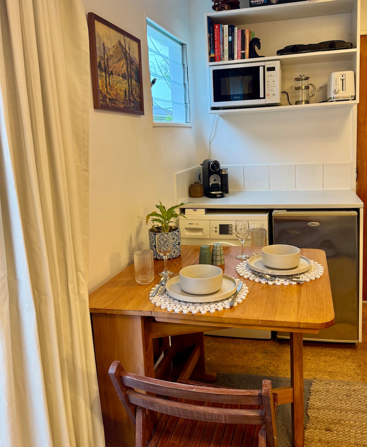 Դասական Վելինգտոնի լեռնալանջի արվարձանում թաքնված այս կոմպակտ ստուդիան առաջարկում է պարզություն, առանձնություն և հմայք ։ Փոքր լոգասենյակով և պարզ խոհարարական հարմարություններով ՝ այն կատարյալ է առանց աղմուկի մնալու համար ։ Մուտքը կատարվում է ընդհանուր կտրուկ ճանապարհով (անցման իսկական Վելինգտոնի ծոց )։ Մոտակայքում կան փողոցային կայանատեղի, ավտոբուսային ծառայություններ և գեղատեսիլ զբոսանք դեպի քաղաք ։ Գնանշված է մատչելի ՝ ավելի հին տան բնավորությամբ և մեր սիրալիր շան ժամանակ առ ժամանակ ողջույնի խոսքերով ։