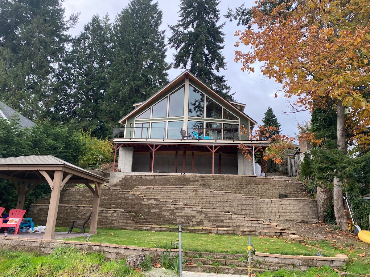 Views from all 5 floors of this rustic hand built treasure, get away in our secluded ocean view, lake waterfront home. Perched just above Picnic Point Lake, descend stairs to the lake waterfront clearing to relax. Our house is unique; the front door has a tree archway, rounded hobbit doors on the side room and front garage. Hand made treasure with 3 decks/balconies or take a stroll to Picnic Point Park for Ocean access. We get a lot of trains! Regularly through day, 2-4 at night.