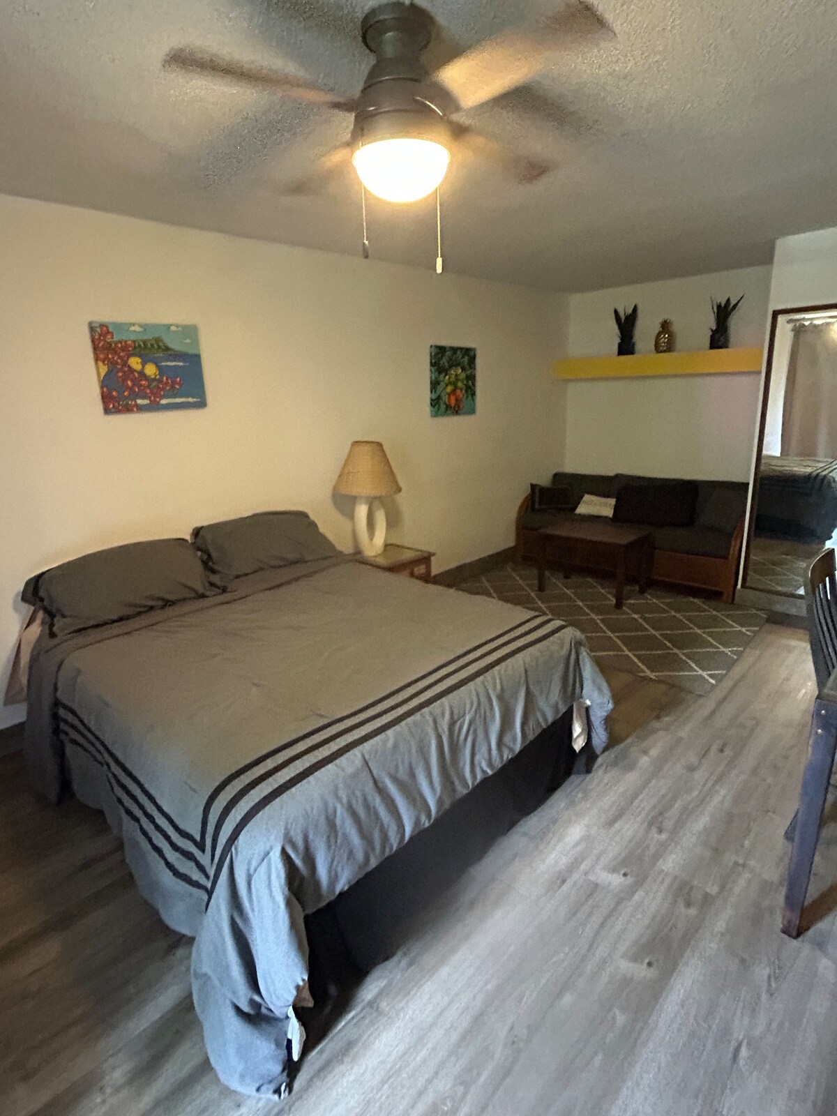 Located conveniently 5 minutes from the airport and a short 15 min drive to downtown Kailua Kona. Vaulted ceilings, a cute lanai to enjoy your morning coffee, large bathroom with double vanity, and a kitchenette make this rental a real gem. The AC is powerful for when the tropical breeze isn't quite cool enough, The WIFI is reliable and there is a large screen TV with ROKU for when you just want to hang out. We offer automated check in, excellent room amenities and flexibility with booking.