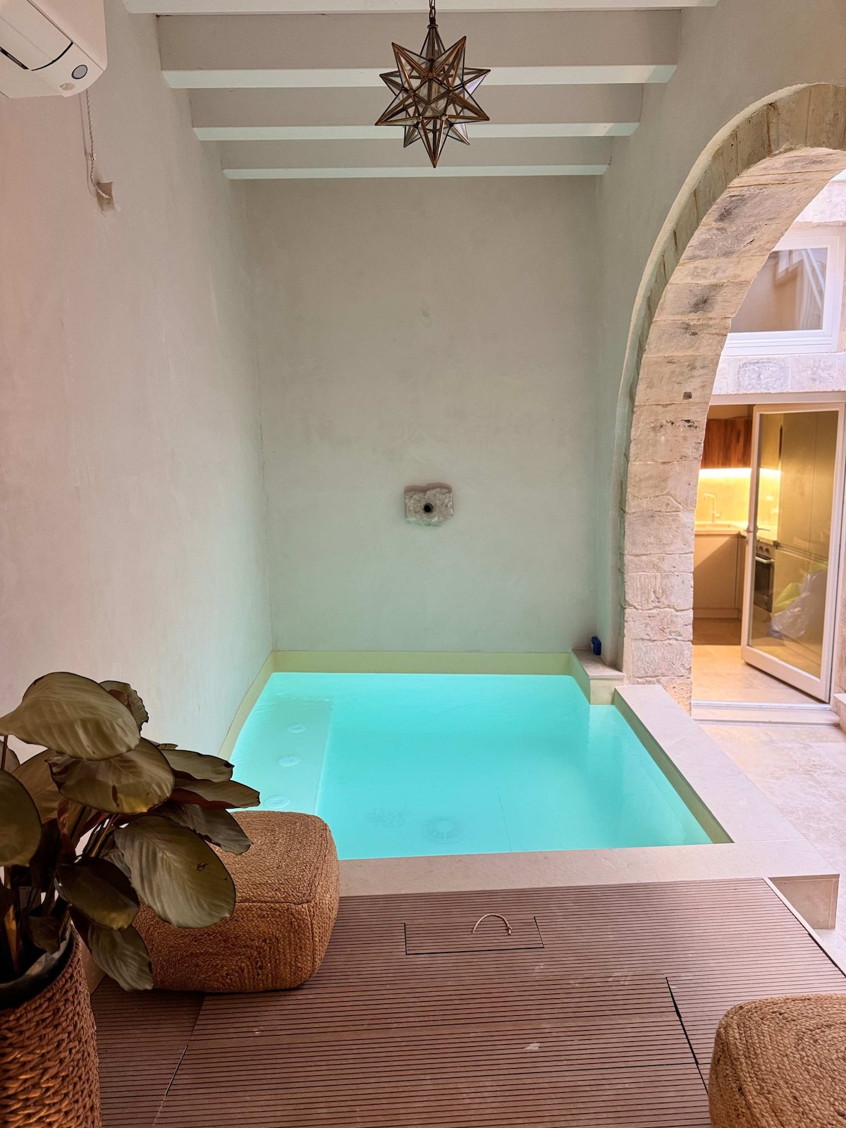 Enjoy your vacation in this stylish designer space in the city center, completed in July 2023. Composed of a King size bedroom, comfy living room, dining room, terrace with hot tub, a fully equipped kitchen and bathroom with a walk-in rain shower. Stay in style and luxury within the historic area of Ortigia and walking distance to all shops, restaurants and a 2 minute walk to the Ionian sea. Adorned with elegant furnishings and art with modern appliances to create a classic and contemporary mix.