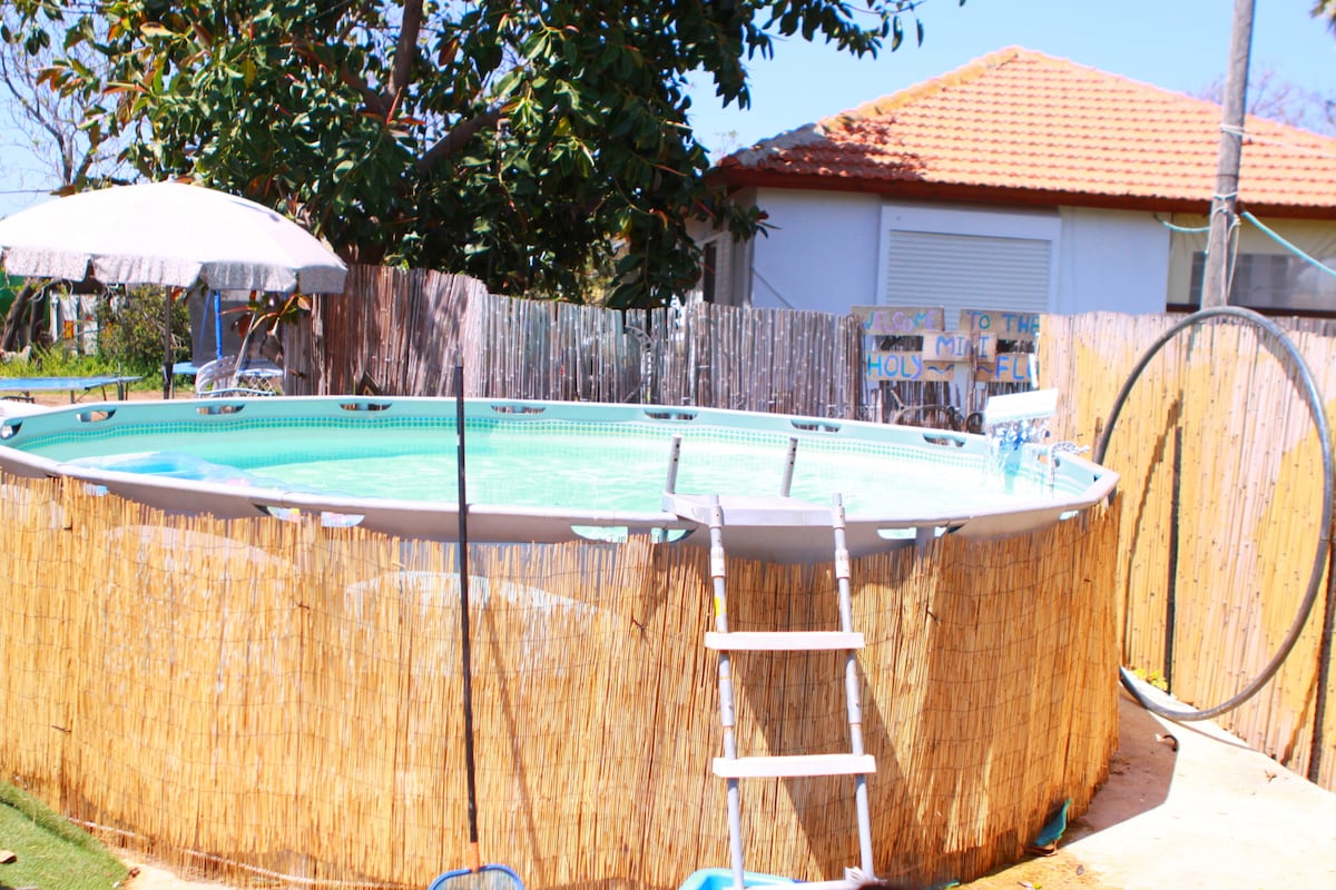 A cool and beautiful tent house In Pardes Chana, right next to the fields, surrounded with a spaceous garden . Thoug it's a tent it feels very cozy and spceouse,with a kitchenet,bathroom and toilet ,an outdoor pool ( on the summer) and shower, and lots of cute siting areas under the trees. it is as closes to nature it can be in the middle of town.