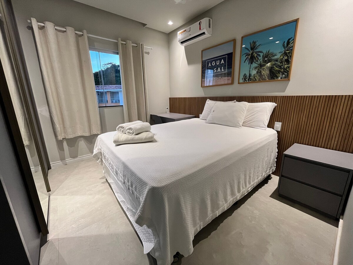 Experience the best of Porto Seguro in this modern apartment, just 350 m from the beach. The accommodation features a suite with a queen bed and Smart TV, plus a bedroom with a double and a single bed. The living room, with air conditioning, sofa bed, and Smart TV, ensures complete comfort. The condominium offers a pool, barbecue area, and playground, while its great location allows you to easily explore restaurants and markets. The experience of your dreams awaits. Book now!