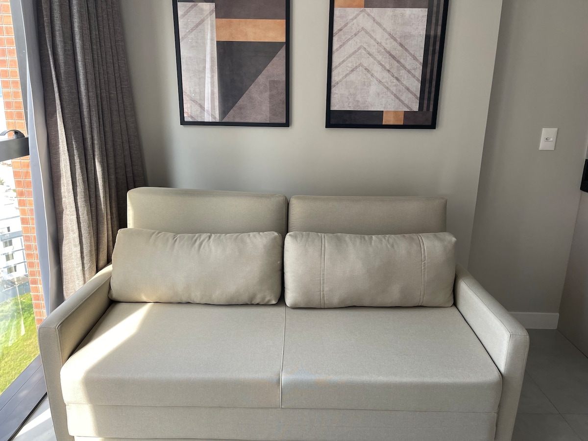 Modern comfort just steps from the sea! Just steps from the beach, this studio was designed for those who value comfort and location. It features a double bed, sofa, Smart TV, air conditioning, an equipped kitchen with integrated dining area, and a charming balcony with city view. The building offers a heated pool and jacuzzi on the rooftop, gym, and game room. Only 220 m from the sea and surrounded by great dining options. Book now and enjoy a complete experience in Meia Praia.