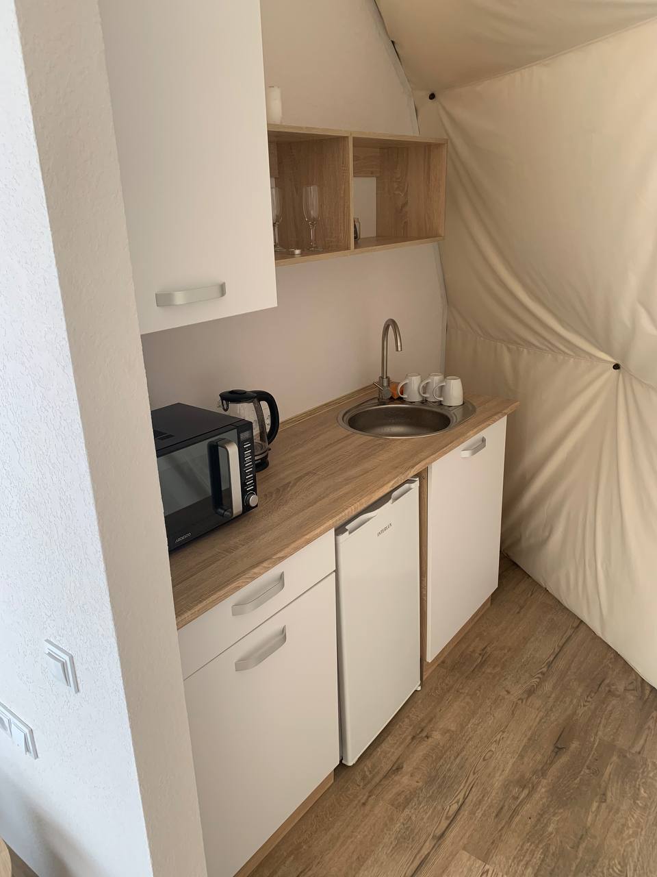 Տնակն ունի փոքր առանձին հարմարավետ և ջերմ ննջասենյակներ, լոգասենյակ ցնցուղով, ջրատաքացուցիչով, փոքր խոհանոցով, սառնարանով, ջեռոցով, թեյնիկով և սրճեփով: Եթե հյուրը նախընտրում է, որ նա կարողանա պատրաստել փայտի վառարանի, ինչպես նաև բարբեքյուի տարածքի միջոցով ։ Ոչ մի հեռուստացույց, բայց գերարագ ինտերնետ կապ (WiFi):