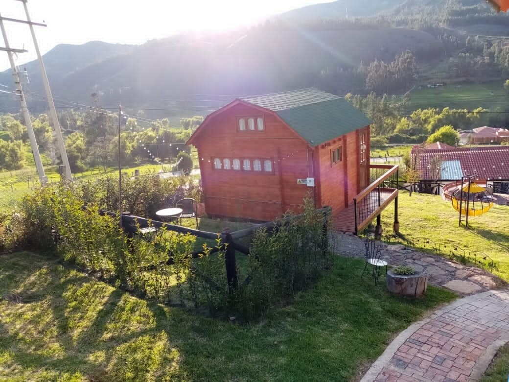 The architecture of the place is in harmony with the environment and nature and the environment, achieving a formidable space for rest and inspiration. The cabin overlooks the Valley of the Willows, ideal for relaxing, disconnecting and resting. It has a green area, space for a campfire, kitchen, hot water, wooden terrace, parking area, Roku TV. Located 90km from the city of Tunja, 14km from the city of Sogamoso, 8 km from Lake Tota