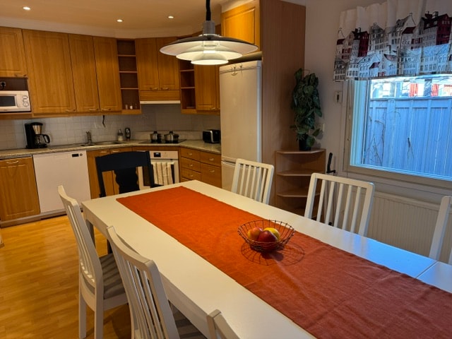 Գեղեցիկ տուն Նյկարլբիի կենտրոնում ։ Մեկ ննջասենյակ ՝ 160 սմ մահճակալով, իսկ վերևի միջանցքում ՝ փոխարկելի բազմոցով ։ Լիովին կահավորված խոհանոց և մեծ բացօթյա պատիո ՝ մանղալով և բացօթյա նստատեղերով ։ Լոգասենյակում մեծ սաունա է ։ Տունը մեր մասնավոր կրկնությունն է, և մենք ունենք մեր իրերը տանը: Տունը գտնվում է սուպերմարկետից 350 մ հեռավորության վրա ։
