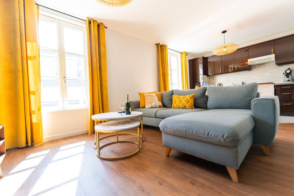 50 մ2 մակերեսով բնակարան, 2 ննջասենյակ, մեկ երկտեղանի և մեկ մեկտեղանի (մեկ աչքով հովանոցով) վերանորոգված ։ --- Gîtes de France - ի կողմից դասակարգված «Meublé de Tourisme» (3 աստղ)--- ---> Գտնվում է երկաթուղային կայարանից ոտքով 2 րոպե հեռավորության վրա և քաղաքի կենտրոնից 10 րոպե հեռավորության վրա ։ Անվճար կայանատեղի ։ Լիովին կահավորված և կոկիկ ձևավորված կոկունով մնալու համար!!!! Նորույթ!!!! ԷՄՄԱ ՀԻԲՐԻԴ II ներքնակ երկտեղանի ննջասենյակում Ճկուն ժամանում և մեկնում ՝ շնորհիվ մինի - սեյֆի, ես ձեր տրամադրության տակ կմնամ ձեր այցի ընթացքում ։