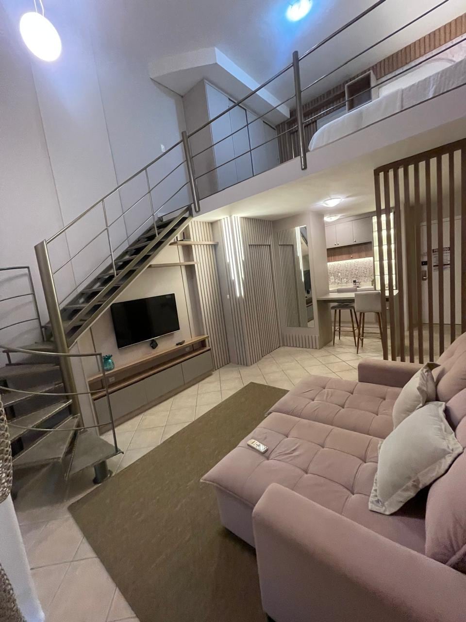 Descubra o conforto e a conveniência do nosso moderno flat duplex, situado a poucos metros do coração da cidade. Perfeito para viajantes a negócios ou lazer, nossa acomodação oferece um ambiente sofisticado e prático, ideal para uma estadia memorável. - Suíte: Cama queen, roupeiro e escrivaninha. Banheiro com hidromassagem; - Sala: Com sofá e smart TV de 50”; - Cozinha completa: Com geladeira, fogão elétrico e micro-ondas; - Lavabo - Ar 24.000 BTUs; - Aquecimento de água central a gás; - Wi-Fi