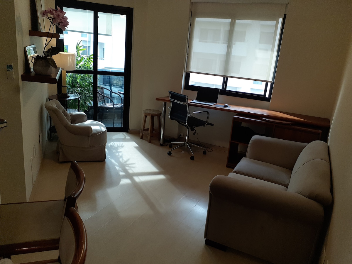 Excelente Localização Região Nobre e Descolada Situado a poucos metros da renomada R. Oscar Freire e do sofisticado CJ Shops, cercado pelo que há de melhor na cidade: os mais aclamados restaurantes, bares, farmácias, salões de beleza e parques . Desfrute de uma vista livre, com um toque de verde que traz serenidade ao seu dia. A rua é reconhecida por ser segura e tranquila, garantindo sua comodidade e paz. *WI-FI de alta velocidade e acesso a NETFLIX. •Importante: Não somos um hotel