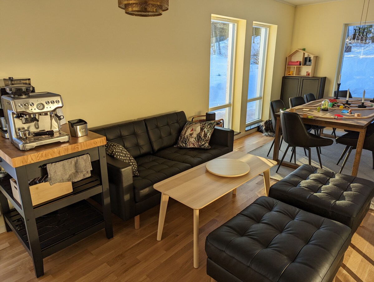 Կախարդական տեսարանները ձեզ հանդիպում են այս գեղեցիկ և նորակառույց (դեկտեմբերի -21) 50 քմ մակերեսով բնակարանում ՝ երկու ննջասենյակով և վեց մահճակալով, բաց խոհանոցով և հյուրասենյակով ՝ համայնապատկերային պատուհանով, պատշգամբով, բազմոցով և բուխարիով ։ Զգացողությունն այն է, որ դուք մտնում եք փոքր տուն, քանի որ մտնում եք գետնի մակարդակից ։ Դուք մոտ եք լեռնադահուկային լանջին, Järvzoo - ին, միջքաղաքային հետքերին, փադել սրահին և գյուղի ռեստորաններին: Տնակի հարմարությունները ներառում են սաունա ՝ տեսարանով, սոցիալական տարածքներ և լվացքասենյակ ։