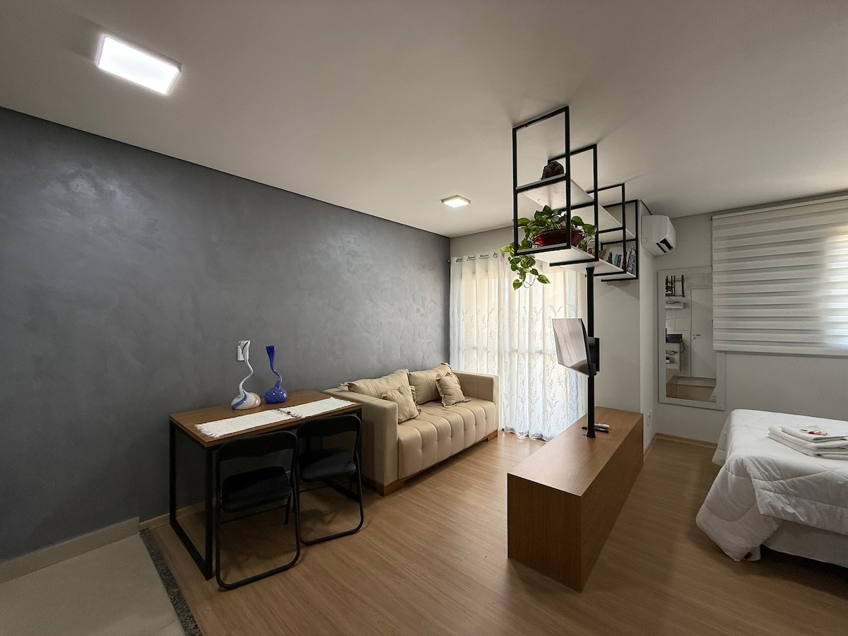 Único! (Pet-friendly) Prédio em condomínio, Lazer e segurança. Studio novinho e aconchegante com garagem priv, ar condicionado e internet (300MB), Tv42 + apple Tv + Chromecast, academia, piscina, sala reuniao, co-working e lavanderia Omo. Praticidade e requinte alto padrão em localização privilegiada. Ao lado do shopping center, hiper mercado, do hospital Amaral Carvalho e diversos bares e restaurantes, tudo isso a curta distancia a pé.