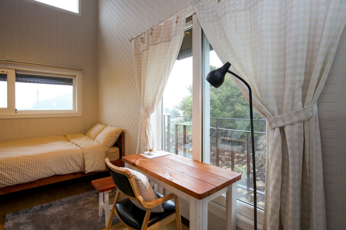 Այն գտնվում է Սեոգվիպոյի և Յունգմուն քաղաքի կենտրոնի միջև, որտեղից տեսարան է բացվում դեպի ծով, իսկ հետևի մասում ՝ Hallasan Mountain - ը ։ Մոտակայքում կա E - mart և Eongto Falls, որտեղ ջուրը հոսում է, երբ անձրև է գալիս ։ Այն գտնվում է միջին լեռնային ճանապարհի վրա, այնպես որ դուք կարող եք հեշտությամբ գտնել այն, և դուք կարող եք վայելել Ջեջու կղզու մթնոլորտը շրջակա տանգերինի դաշտերով: Առավոտյան ծովը կարելի է տեսնել հեռվում, իսկ գիշերը շատ աստղեր կան: Արդեն 10 տարի է, ինչ տեղափոխվել եմ Ջեջու կղզի ։ Մենք ապրում ենք անզուգական գոհունակությամբ մեր կյանքի ընթացքում: 2019 թվականից սկսած ՝ մենք նոր տուն ենք կառուցում մեր առջև ։ Ճիշտ այնպես, ինչպես մեր ընտանիքը լիովին բավարարված է, հուսով ենք, որ բոլոր հյուրերը, ովքեր գալիս են մեր տուն, կստեղծեն շատ հիշողություններ, որոնք հարմարավետ են, զվարճալի և երջանիկ: ^^