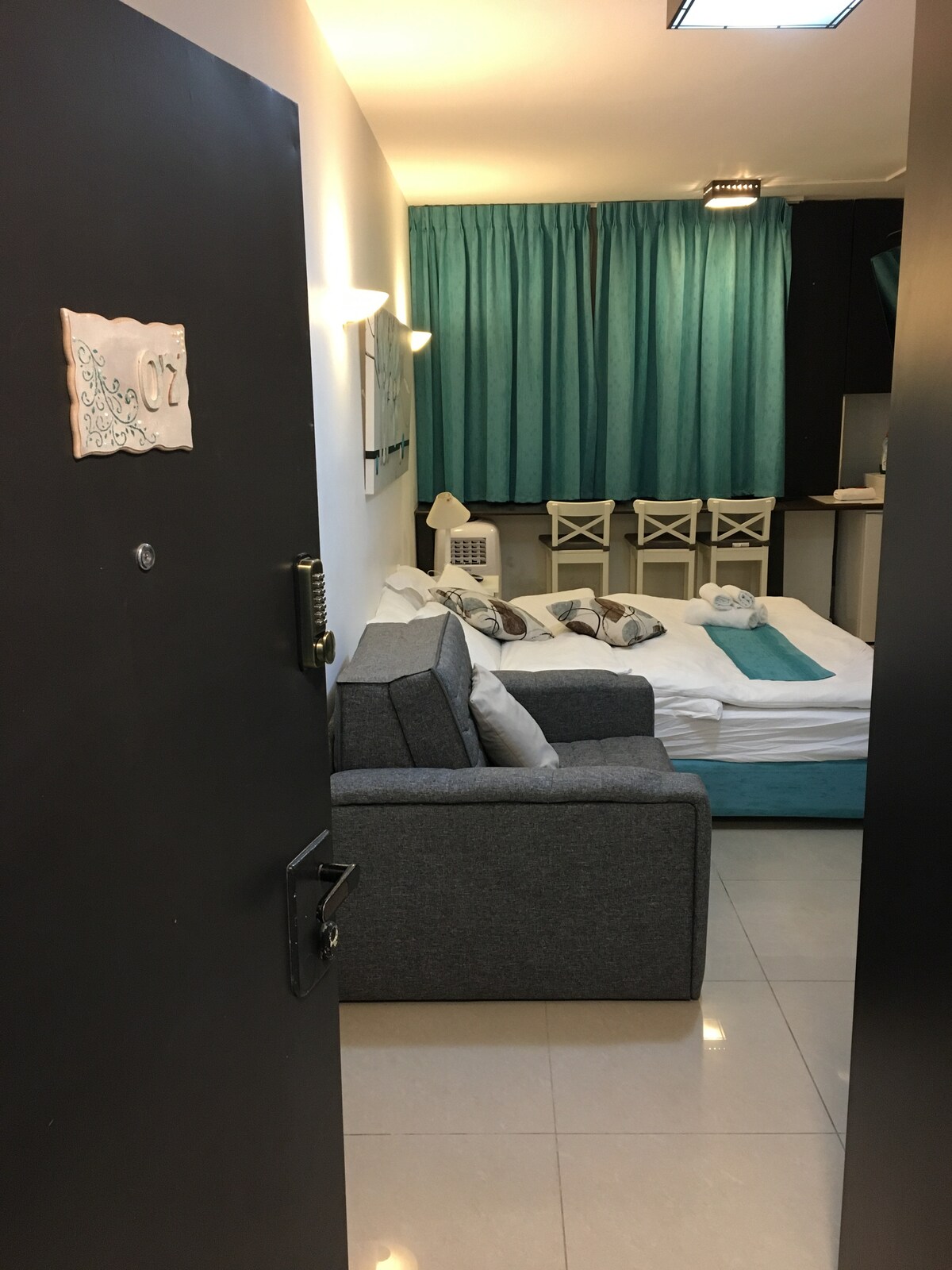 Ստուդիո բնակարան ՝ անվճար կայանատեղով, որը գտնվում է հանգիստ թաղամասում ՝ գեղեցիկ պարտեզով ։ Հասարակական տրանսպորտից օգտվելու շատ հեշտ հնարավորություն ։ Բացի այդ, ոտքով 3 րոպե հեռավորության վրա կա սուպերմարկետ և մթերային խանութ ։ Բնակարանը տրոհված է նստարանի և քնելու տարածքի, առանձին խոհանոցի և արևոտ ճաշասենյակի /նստարանի միջև ։ Ստուդիան կարող է հարմարավետ քնել երկու հոգու հետ ՝ երկու առանձին մահճակալ : Պաղեստինի նախաճաշը և մերձավորարևելյան կերակուրները հասանելի են ըստ պահանջի: