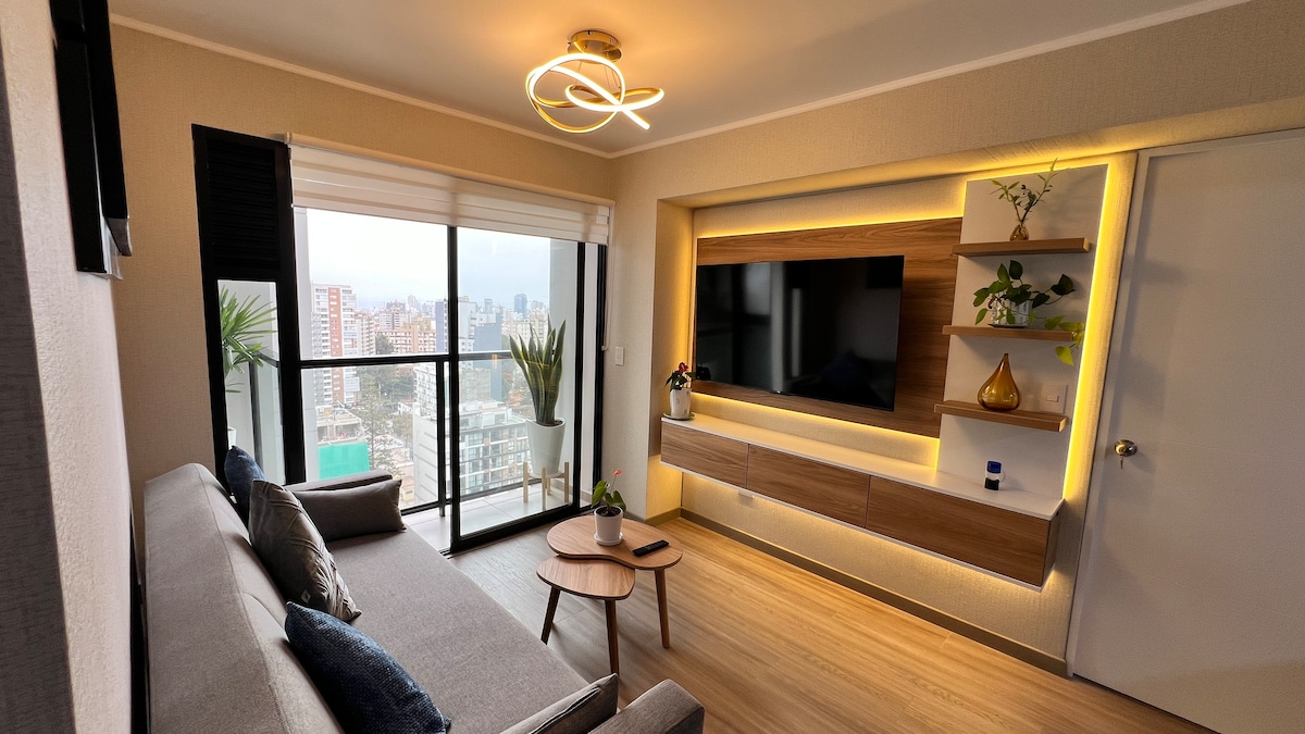 Ժամանակակից, հարմարավետ և լուսավոր ✨ Այս ամբողջական բնակարանը ունի պատշգամբ, որը կատարյալ է բացօթյա աշխատելու կամ հանգստանալու համար։ Շատ լավ է գտնվում ՝ Լաս Ագուաս զբոսայգու, Ազգային մարզադաշտի և Լիմայի պատմական կենտրոնի մոտակայքում ։ Նաև մի քանի րոպե Լա Ռամբլա Բրազիլիայից և Real Plaza Centro Cívico - ից ։ Այն ունի 65դյույմանոց հեռուստացույցով հյուրասենյակ, կահավորված խոհանոց, ննջասենյակ ՝ 2 պլազա մահճակալով և 43դյույմանոց հեռուստացույց, լոգասենյակ ՝ հարմարություններով և լվացքատուն ՝ լվացքատունով ։ Կատարյալ է Լիմայում մնալու համար ։